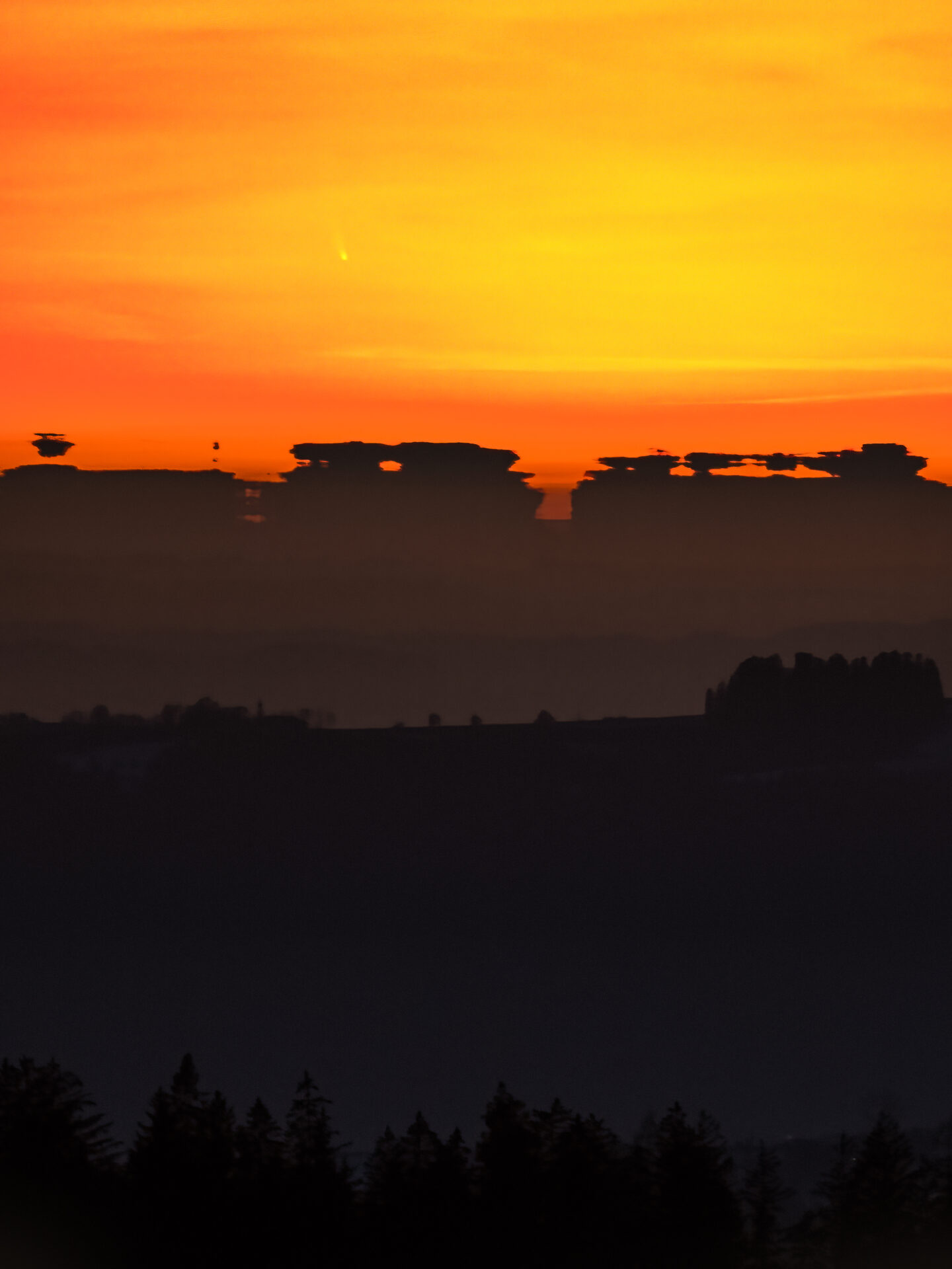 Am 14.1. konnte ich C/2024 G3 unmittelbar nach Sonnenuntergang mit dem Feldstecher sehen und auch mit meinem Nikon 500mm PF Objektiv, sowie meiner Nikon D850 (f/5.6, 1/13s, ISO 800) ablichten. Aufgenommen habe ich das Bild vom Oberneukirchner Berg aus im Mühlviertel. Leider waren es schwierige Bedingungen mit tafelbergartigen Wolken unterhalb und Schleierwolken vor dem Kometen – aber dankenswerterweise zumindest ein Sichtfenster.