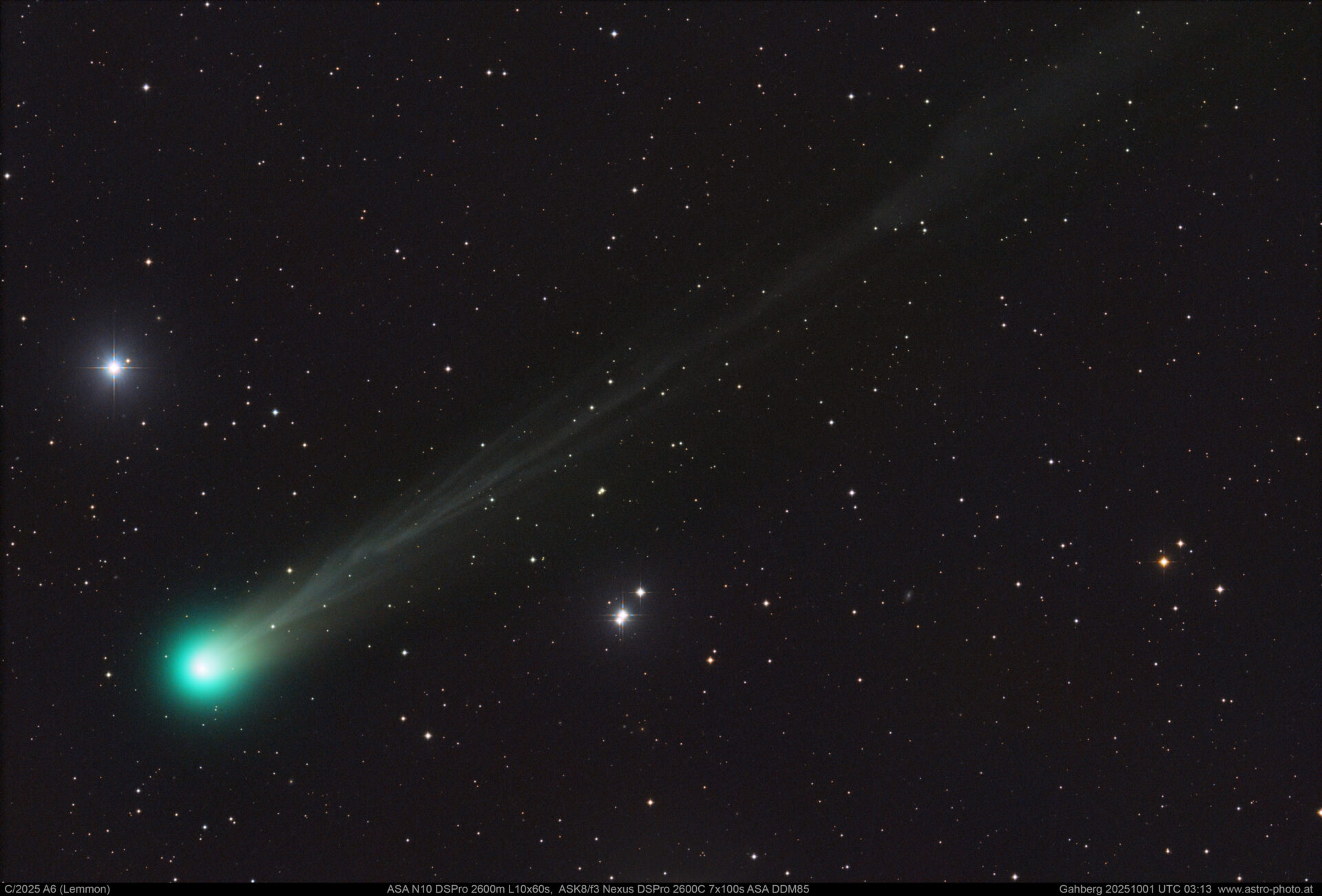 Objektname C/2025 A6 (Lemmon) Aufnahmedatum 1. Oktober 2025 - 5:13 Aufnahmeort Sternwarte Gahberg Seeing Gut Montierung ASA DDM85 Teleskop / Objektiv ASAN10 für L, ASK8" für C Kamera DSPro2600 Verwendete Filter keine