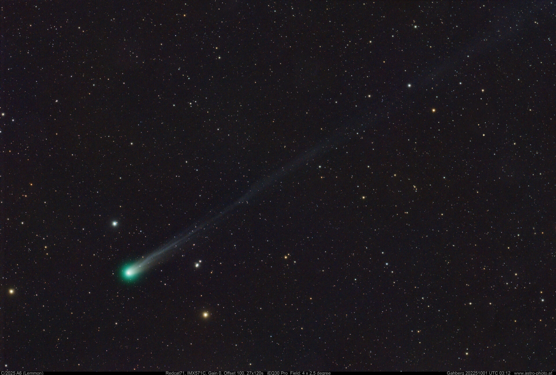 Objektname C/2025 A6 (Lemmon) Aufnahmedatum 1. Oktober 2025 - 5:12 Aufnahmeort Sternwarte Gahberg Seeing Gut Montierung iEQ30Pro Teleskop / Objektiv Redcat 71 Kamera IMx571C Verwendete Filter keine
