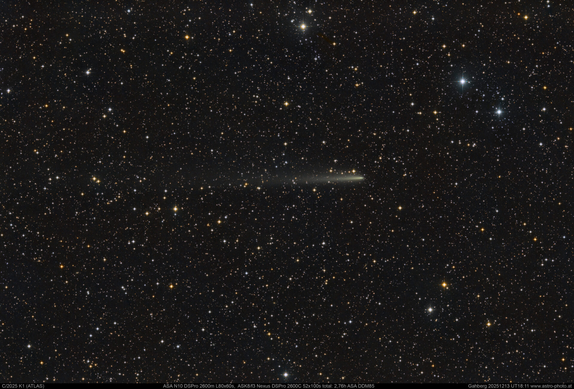 Objektname C/2025 K1 (ATLAS) Aufnahmedatum Aufnahmeort Gahberg Seeing Mittel Montierung ASA DDM85 Teleskop / Objektiv ASAN10 L, 8" f3 C Kamera IMX571M, IMX571C Verwendete Filter keine