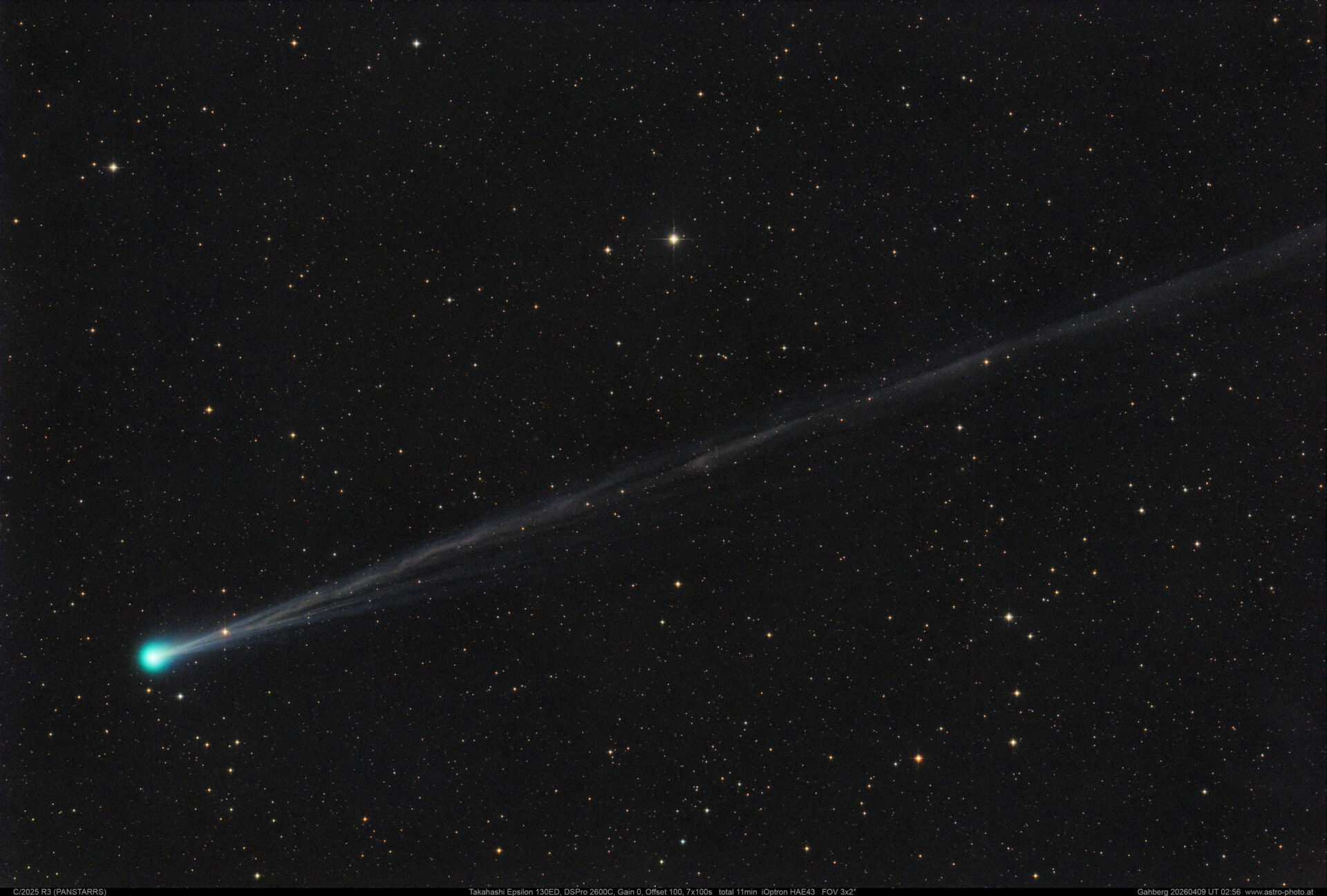 Objektname C/2025 R3 Panstarrs Aufnahmedatum 9. April 2026 - 4:56 Aufnahmeort Sternwarte Gahberg Seeing Gut Montierung iOptron HAE43 Teleskop / Objektiv Takahashi Epsilon 130D Kamera IMX571 Touptec Verwendete Filter keine