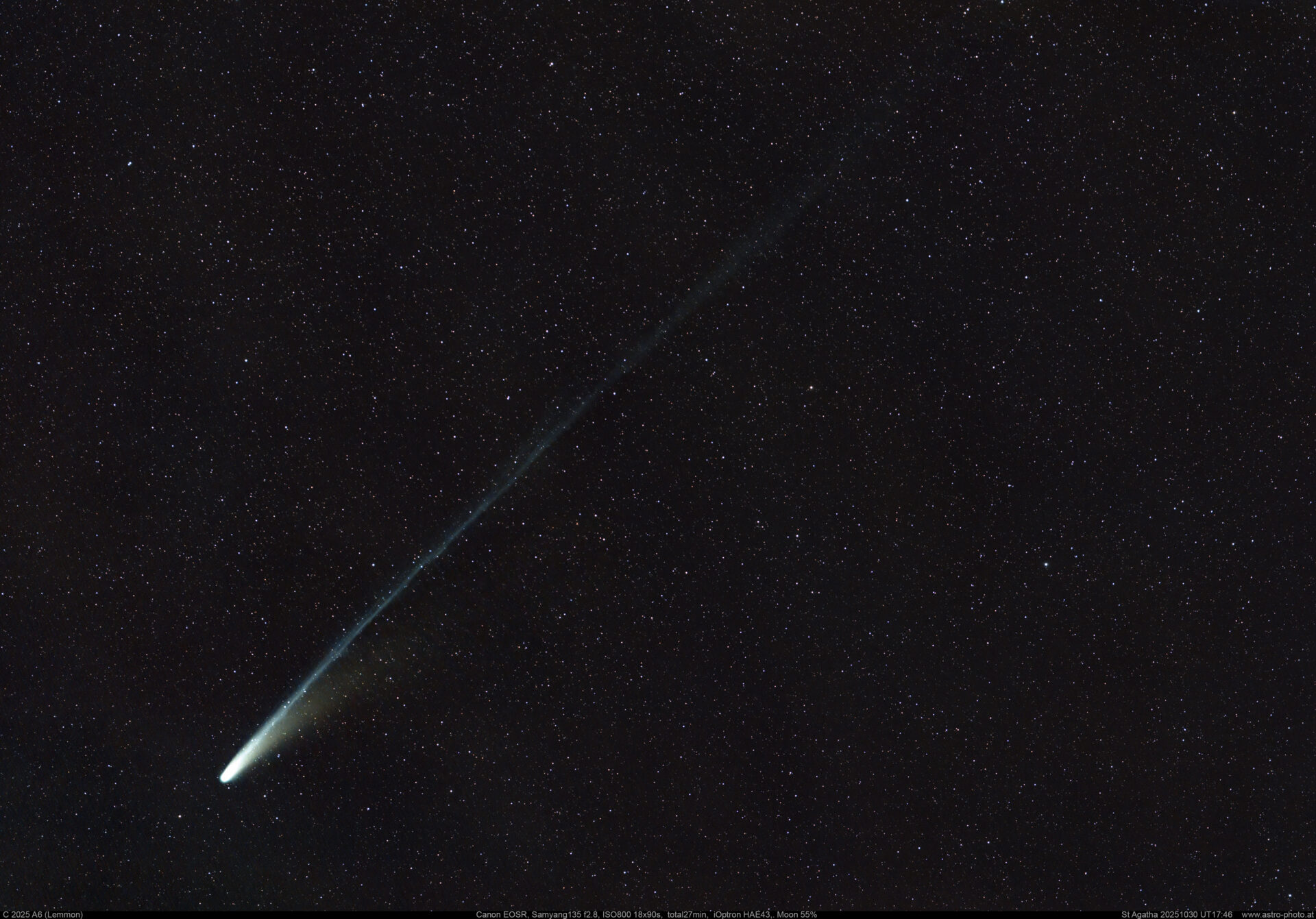 Objektname C 2025 A6 (Lemmon) Aufnahmedatum 30. Oktober 2025 - 18:44 Aufnahmeort St Agatha Seeing Ausgezeichnet Montierung iOptron HAE43 Teleskop / Objektiv Samyang135mm Kamera Canon EOSR Verwendete Filter keine
