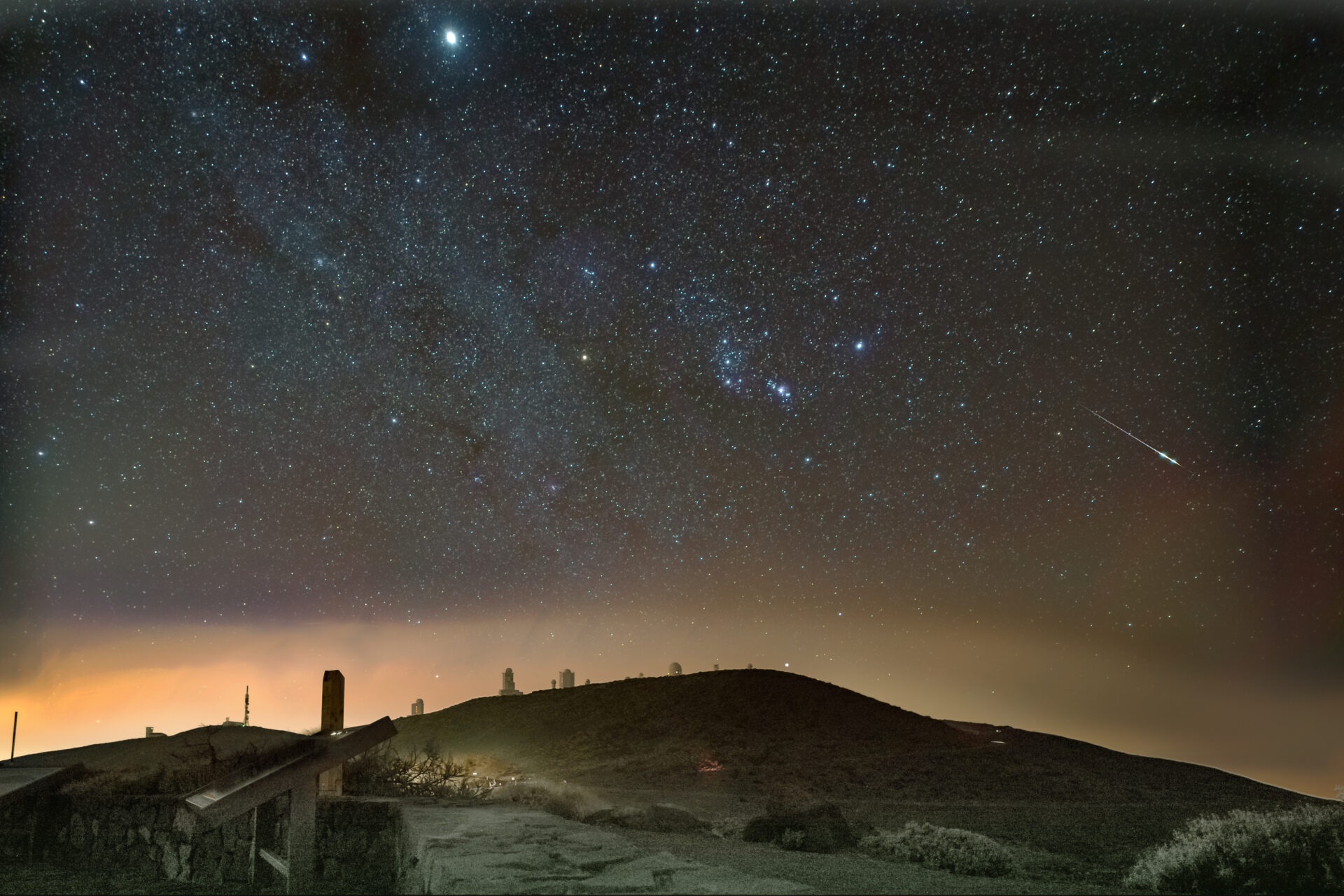 Feuerkugel über den Sonnenobservatorien auf der Caldera Canadas del Teide in Teneriffa