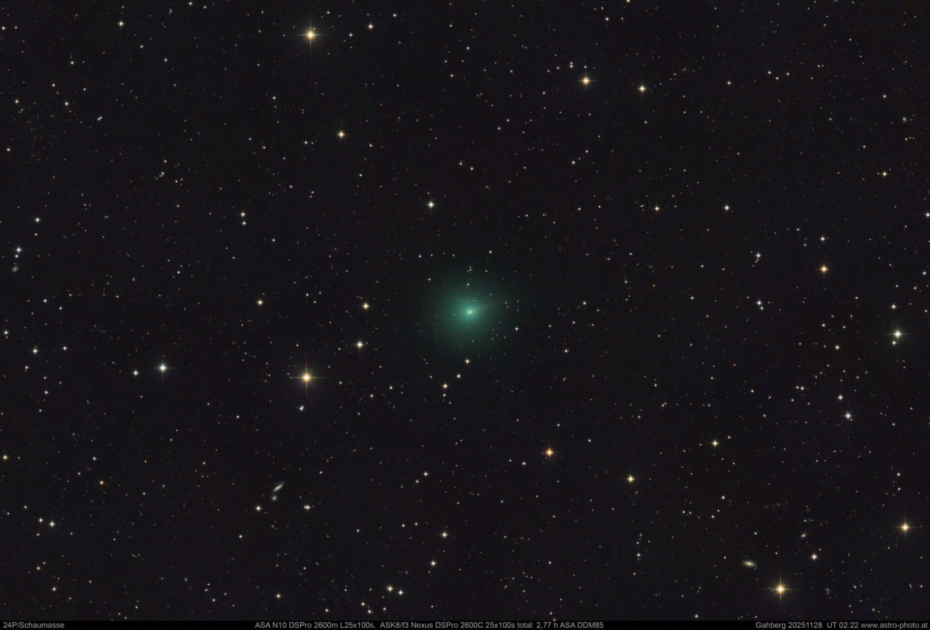 Objektname 24P/Schaumasse Aufnahmedatum 28. November 2025 - 3:22 Aufnahmeort Sternwarte Gahberg Seeing Gut Montierung ASA DDM85 Teleskop / Objektiv ASAN10Luminanz, 8"f3 Color Kamera IMX571M und IM571C Verwendete Filter keine