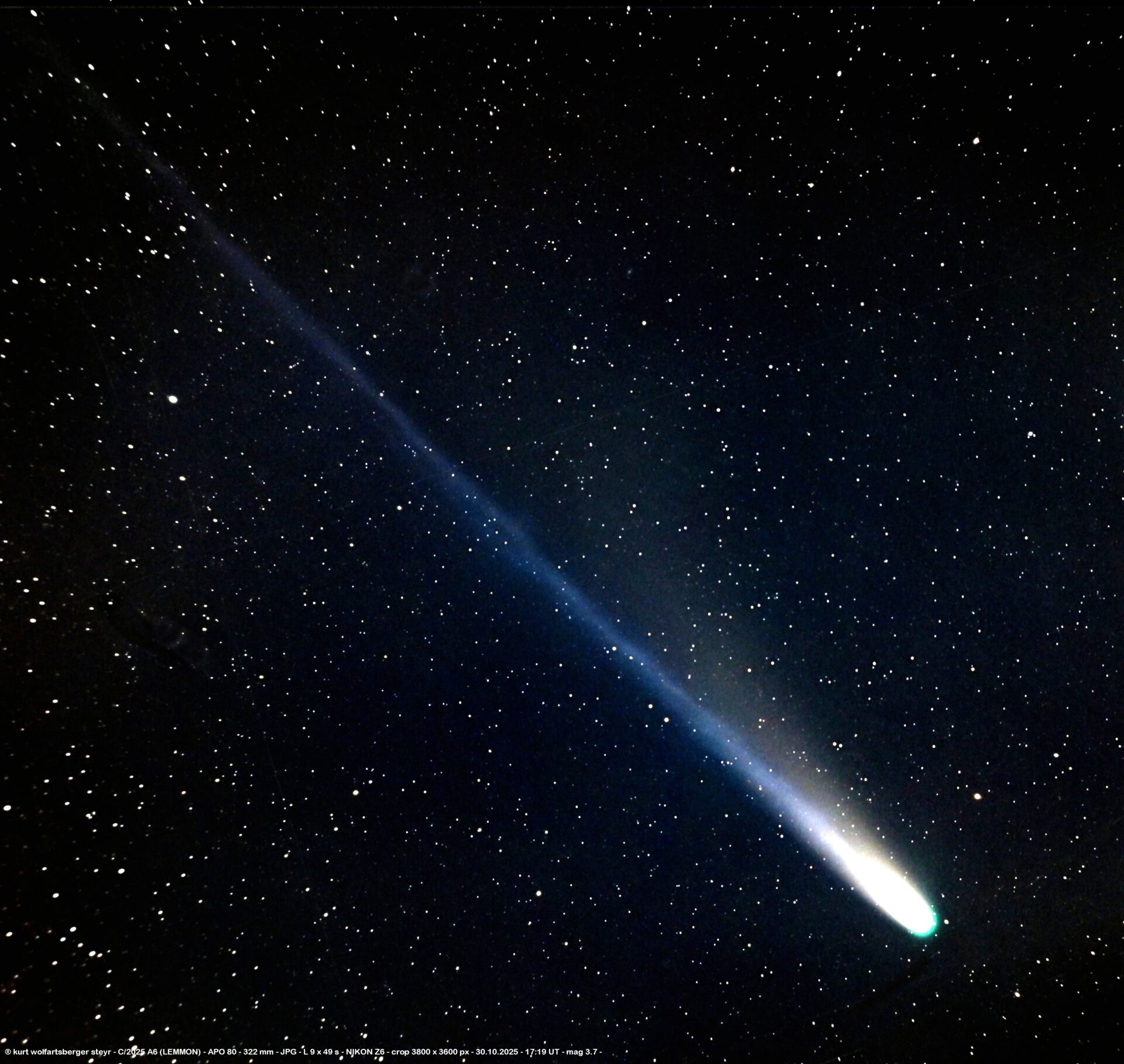 Objektname KOMET C/2025 A6 (LEMMON) Aufnahmedatum 30. Oktober 2025 - 18:00 Aufnahmeort STEYR OÖ Seeing Mittel Montierung iOptron GEM 28 Teleskop / Objektiv APO 80 - 480 (322) mm Flattener Kamera NIKON Z6 Verwendete Filter Stadtlichtfilter, Reducer 80%