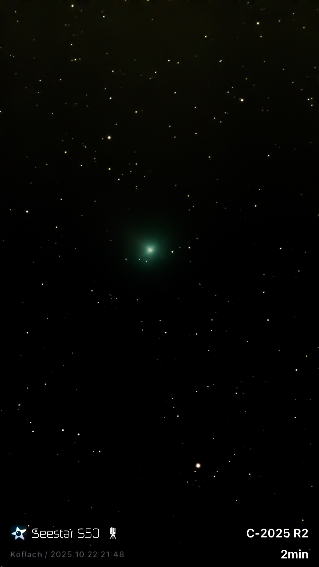 Objektname C-2025 R2 Aufnahmedatum 22. Oktober 2025 - 0:00 Aufnahmeort Köflach Steiermark Seeing Mittel Montierung Seestar S50 Teleskop / Objektiv 50/250 mm f5 Kamera sony Verwendete Filter IR Cut
