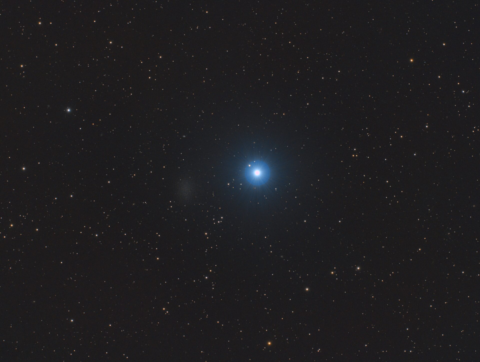 Ein wenig versteckt hinter Regulus (Const. Leo) steht Leo I, eine der gut 20 Zwerggalaxien, die die Milchstrasse umkreisen (Bekanntere Exemplare sind die beiden Magellanschen Wolken am Südhimmel). Sie hat etwa ein Zehntausendstels der Sterne unserer Galaxis. Im Bild ist sie leicht zu übersehen, sie steht links von Regulus, etwas unterhalb, als milichiger, ovaler Fleck.