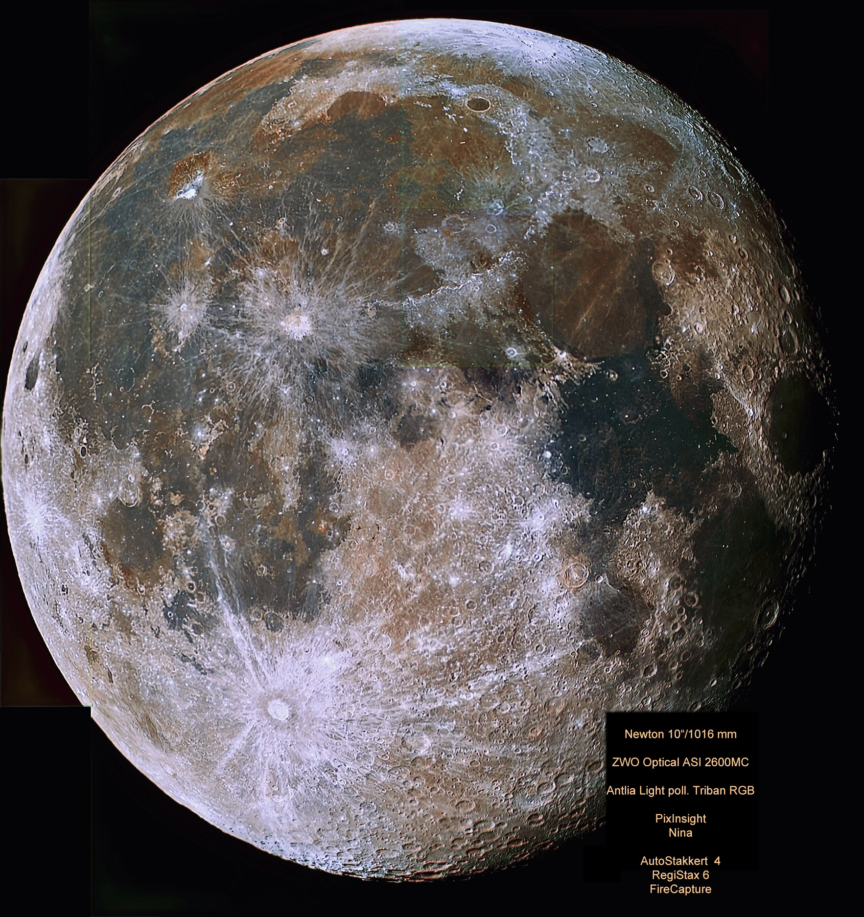 Objektname Mond Aufnahmedatum 24. September 2024 - 0:00 Aufnahmeort Wissen, Germany Seeing Gut Montierung Equatorial Sky-Watcher EQ6-R Pro Teleskop / Objektiv Omegon Newtonian 10"/1016 mm 10" Astrograph Kamera ZWO Optical ASI 2600MC Duo (CMOS) Verwendete Filter Belichtungszeit in Stunden 0,05 Verwendete Software PixInsight (Pleiades Astrophoto)NinaAutoStakkert! 4RegiStax 6FireCapture Autor Tobias Laumann