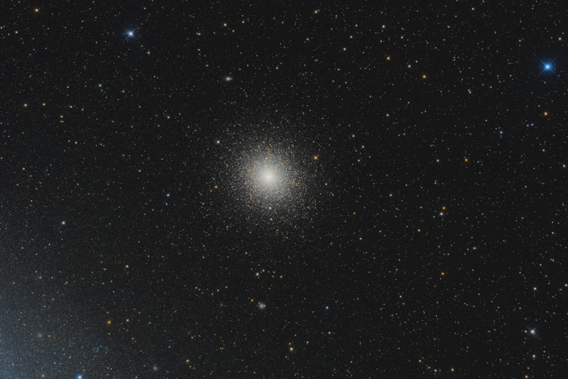 NGC 104 ist der zweitgrößte und zweithellste Kugelsternhaufen am Himmel. Links unten sieht man einen Teil der Kleinen Magellanschen Wolke.