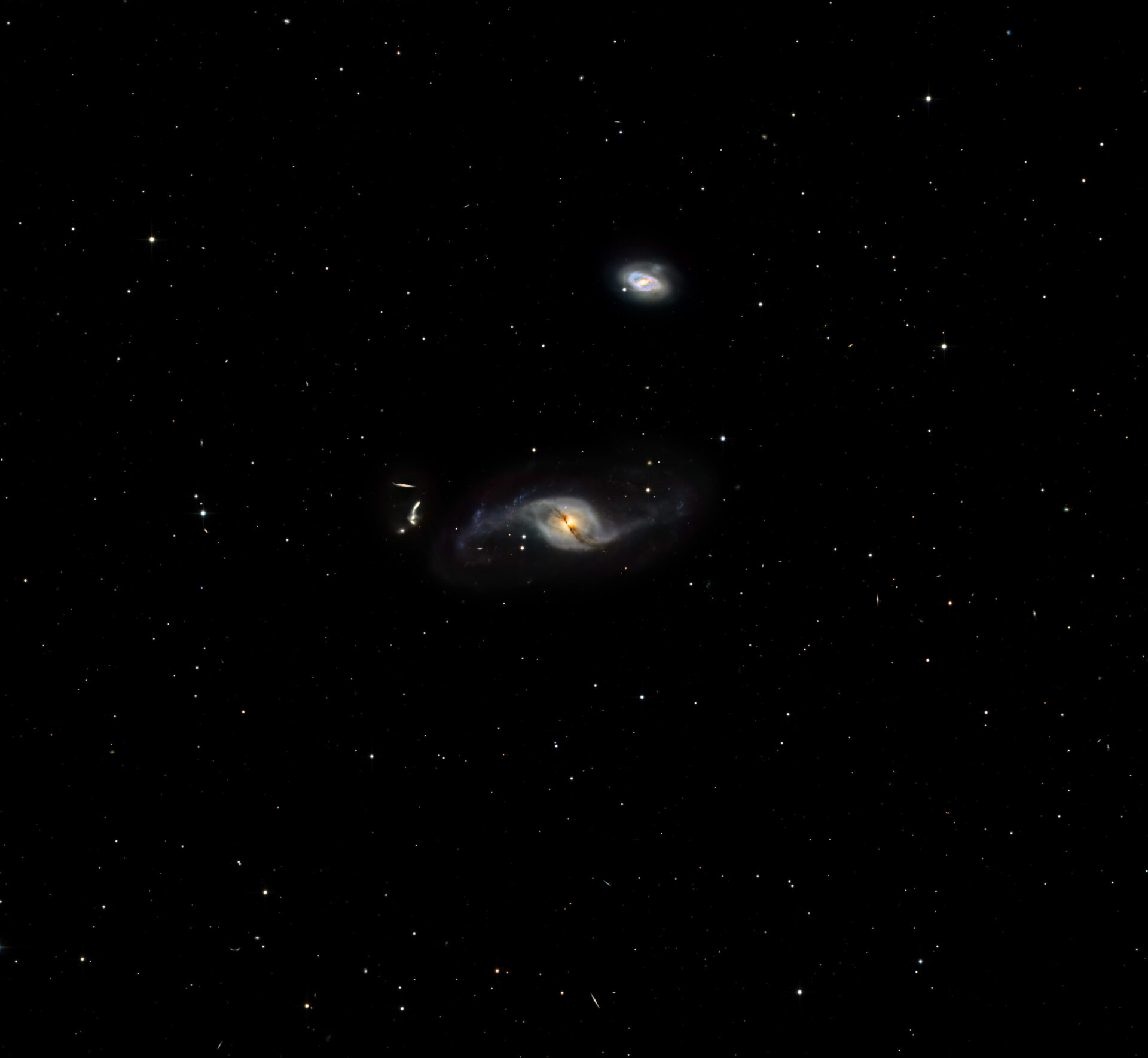 Oben im Bild ist NGC3729, links liegt Hickson Compact Group (HGC) 56, eine Gruppe von fünf etwa 370 Mio Lj entfernten Galaxien.