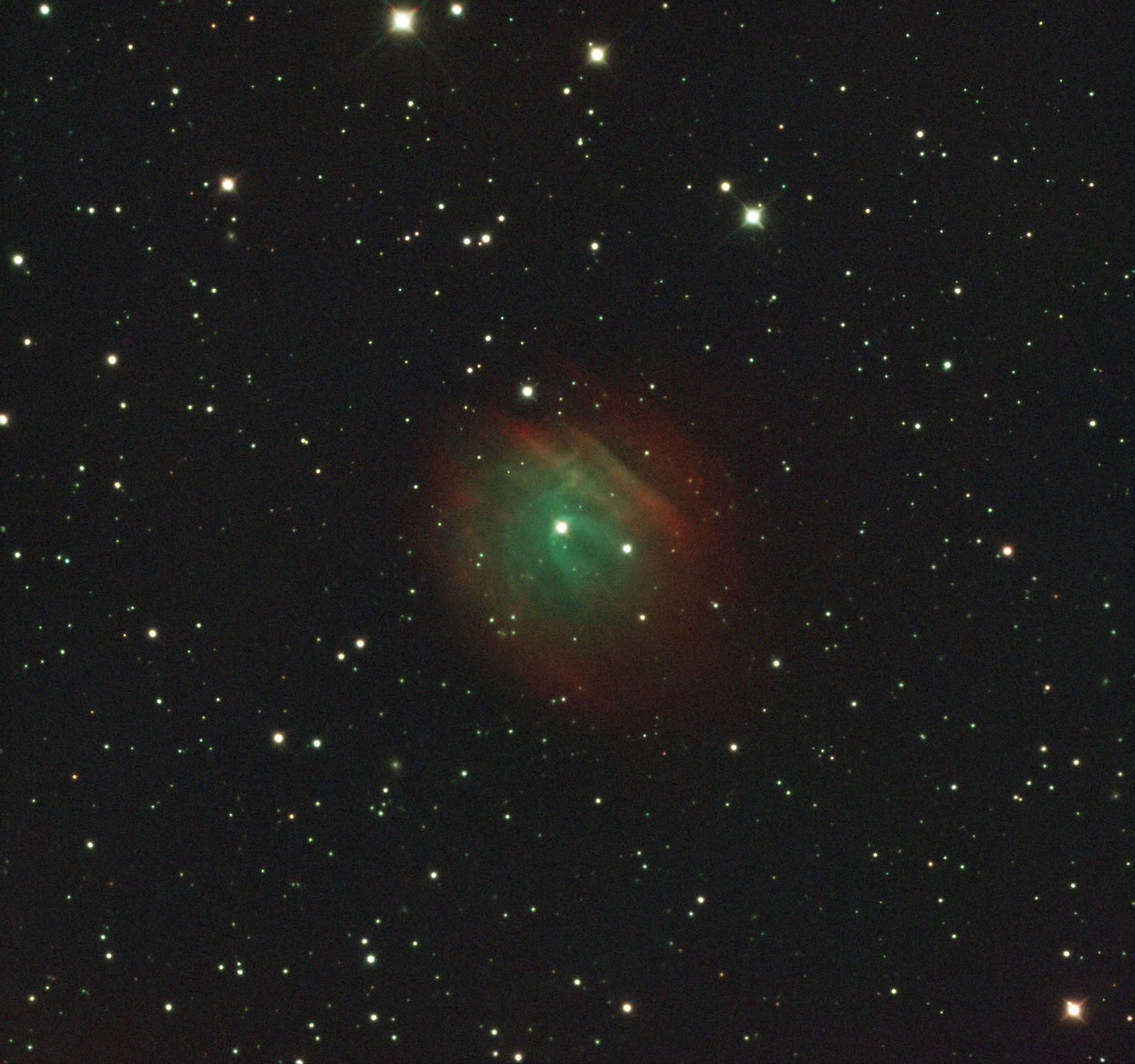Objektname Abell 35 Aufnahmedatum 28. April 2025 - 23:00 Aufnahmeort Sternwarte Gahberg Remotebox Seeing Montierung Skywatcher EQ 8 Teleskop / Objektiv Takahashi E130D Kamera ZWO Asi 533mc-pro Verwendete Filter Optolong Dualband Filter l-Extrem