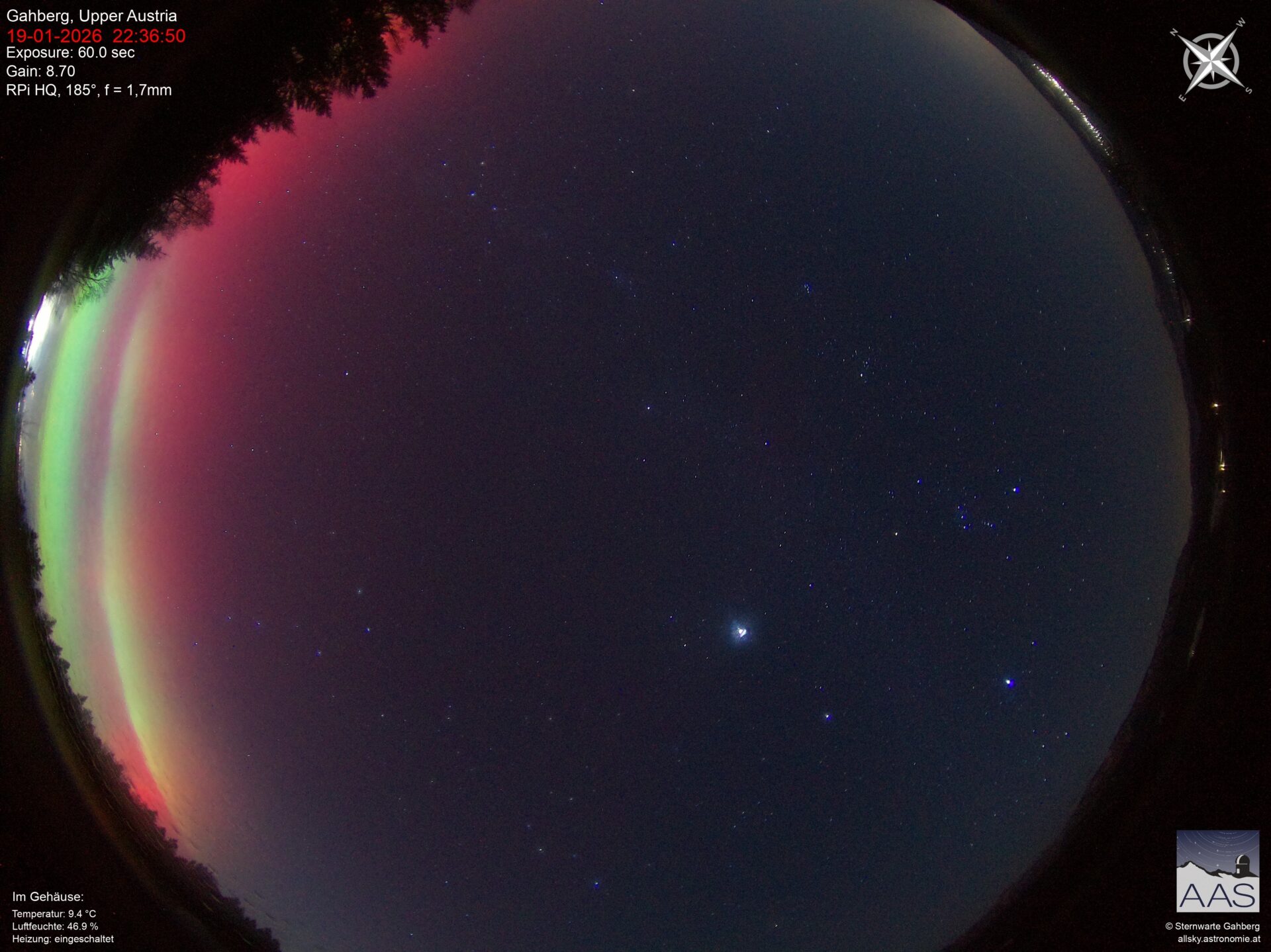 Objektname Polarlichter Allsky Zeitraffer 19./20. Jänner 2026 Aufnahmedatum 19. Januar 2026 - 22:36 Aufnahmeort Sternwarte Gahberg, Upper Austria Seeing Ausgezeichnet Montierung Allsky Kamera Teleskop / Objektiv Fisheye 185°, f = 1,7mm Kamera RPI HQ Verwendete Filter -