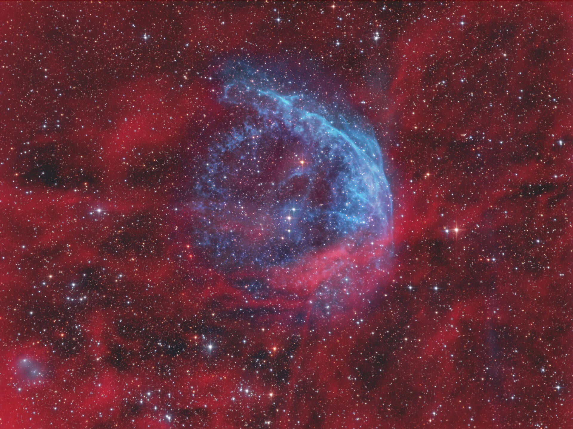 Objektname WR 134 Aufnahmedatum 19. Juni 2023 - 0:00 Aufnahmeort Erdweg/Bayern Seeing Gut Montierung 10 Micron GM 1000 HPS Teleskop / Objektiv 10" Lacerta Newton (1:4) Kamera SBIG ST8300M Verwendete Filter Baader HαOIIIRGB