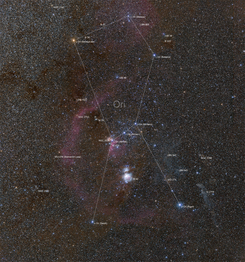 Am deutlichsten ist der Orion am Himmel erkennbar, da er ein sehr auffallendes Sternbild ist. Links oben als Schulter des Kriegers Orion leuchtet der helle rötliche Stern Beteugeuze und rechts unten als Fuß erstrahlt der helle