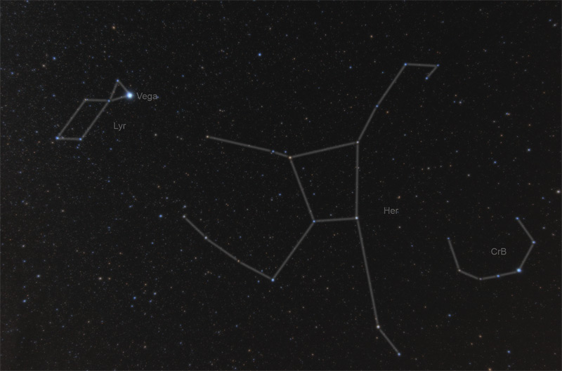 | Erstellt von Karoline Stangl – Astronomischer Arbeitskreis Salzkammergut Titelfoto: Bernhard Hubl – Sternbild Herkules Nach der Sommersonnwende werden die Nächte langsam wieder länger, wobei die Beobachtungszeit mit absoluter Dunkelheit noch immer sehr kurz ist. Der Mond im Juli: 02. Juli Erstes Viertel 10. Juli Vollmond 18. Juli Letztes Viertel 24. Juli Neumond Die Planeten im Juli: Mars wandert im Juli vom Sternbild Löwe ins Sternbild Jungfrau. Seine Helligkeit und Sichtbarkeit nehmen weiterhin stark ab und er ist nur mehr bis Mitte des Monats mit freiem Auge auszumachen. Am 28. Juli zieht der Mond am Mars vorbei. Jupiter taucht Mitte Juli am Morgenhimmel auf und ist anfangs in der Morgendämmerung kaum auszumachen. Bis Monatsende verfrühen sich seine Aufgänge und am letzten Juli taucht der Riesenplanet schon um 03:30 Uhr am Osthorizont auf. Am 22. Juli begegnen sich gegen 04:00 Uhr morgens, der gerade aufgehende Jupiter mit Venus und der abnehmenden Mondsichel am Osthorizont. Merkur hat seine Abendsichtbarkeit beendet und wird Mitte August am Morgenhimmel aufgehen. Saturn geht in den späten Abendstunden auf und ist besonders in der zweiten Nachthälfte sehr gut zu beobachten. Am 16. Juli treffen sich der abnehmende Halbmond und der Ringplanet, wobei dieses Ereignis erst nach Mitternacht zu beobachten ist. Die Venus leuchtet im Juli weiterhin als Morgenstern. Sie geht schon kurz vor 03:00 auf und ist bevor sie im Sonnenlicht verblasst, schon relativ hoch am Himmel zu sehen. Am 22. Juli bilden Venus, Mond und der Stern Aldebaran und Jupiter gegen 04:00 Uhr eine interessante Konstellation am Morgenhimmel. Der Sternenhimmel im Juli: Das Frühlingsdreieck aus den drei hell leuchtenden Sternen Arkturus, Regulus und Spica ist mittlerweile untergegangen und macht dem Sommerdreieck mit den hellen Sternen Deneb, Wega und Atair Platz. Deneb befindet sich im Sternbild Schwan, Wega in der Leier und Atair gehört zum Sternbild Adler. Grafiken vom Sommerdreieck von Sonja Hufnagl: ![]() ![]() ![]() Foto von Bernhard Hubl – Sommerdreieck mit den Sternen Deneb, Wega und Atair: ![]() Wega (auch Vega) ist, nach Sirius und Arkturus, der dritthellste Stern, der auf der nördlichen Erdhalbkugel zu sehen ist und der hellste Stern im Sommerdreieck. Wega ist nur 25 Lichtjahre von unserer Erde entfernt und damit für einen Stern relativ nahe gelegen. Tief am Horizont im Osten sind die Sternbilder Steinbock und Schütze zu erkennen. Dann kommen der Schlangenträger und schließlich der Skorpion mit seinem orange leuchtenden Hauptstern Antares, welcher leicht mit dem Planeten Mars verwechselt werden kann. Im Sternbild Boots ist Arkturus als besonders heller Stern gut zu erkennen. Am südlichen Nachthimmel hoch am Horizont über dem Schlangenträger und dem Skorpion ist das Sternbild Herkules auszumachen. Herkules ist das fünftgrößte Sternbild am Himmel. Es enthält auch zwei interessante Kugelsternhaufen, die bereits mit einem guten Fernglas zu sehen sind. Der dritthellste Stern im Herkules, Alpha Herculis, ist ein Doppelstern. In der Antike hatte dieses Sternbild den Namen „der Kniende“. Erhalten hat sich jedoch der Name Herkules, der mit Stärke und Kraft in Verbindung gebracht wird. |