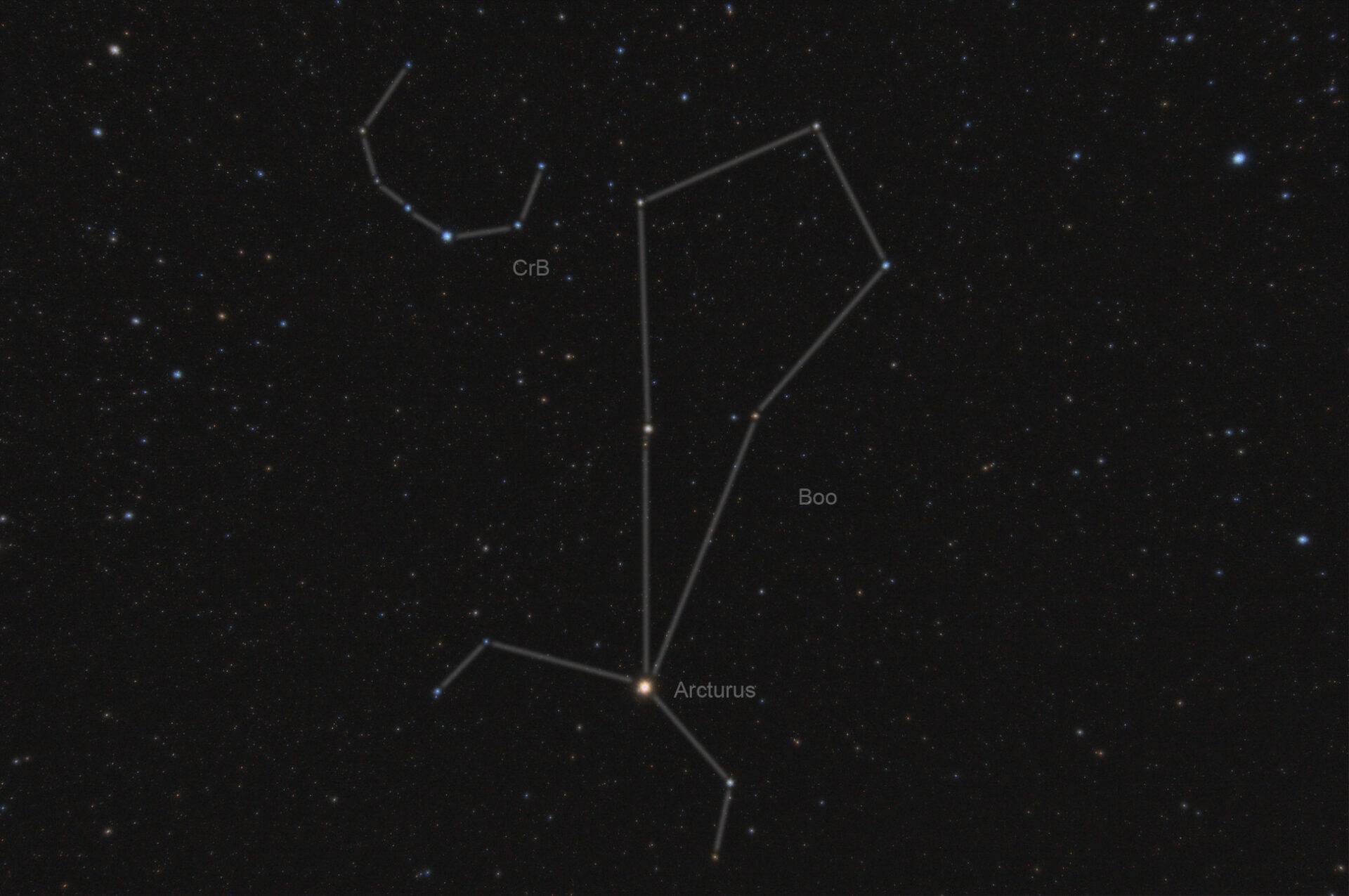 | Erstellt von Karoline Stangl – Astronomischer Arbeitskreis Salzkammergut Titelfoto: Grafik Stellarium – Sonja Hufnagl Am 21. Juni um 03:42 Uhr beginnt der Astronomische Sommer. An diesem Tag der Sommersonnwende erreicht die Sonne ihren höchsten Punkt. Die Tageslänge beträgt damit die maximale Zeit von 16 Stunden. Astronomische Dunkelheit herrscht in dieser Nacht nur 3 Stunden. Der Mond im Juni: 03. Juni Erstes Viertel 11. Juni Vollmond 18. Juni Letztes Viertel 25. Juni Neumond Die Planeten im Juni: Mars ist im Juni im Sternbild Löwe zu beobachten. Seine Helligkeit und für uns beobachtbare Größe nimmt weiterhin stark ab. Er ist nur in der ersten Nachthälfte zu sehen und geht um die Mitternachtszeit im Westen unter. In der Nacht vom 1. Juni zieht die zunehmende Mondsichel am Mars vorbei und am 30. Juni begegnen sich nochmals der zunehmende Mond und der Mars. Jupiter ist in den ersten Junitagen nur mehr mit einem Fernglas am westlichen Horizont auszumachen, da er immer früher untergeht und die Sonne immer länger am Himmel steht. Er zieht sich dann vollständig vom Nachthimmel zurück. Am 8. Juni begegnen sich Jupiter und Merkur. Merkur kann ab Mitte Juni bei sehr günstigen Sichtbedingungen von versierten Beobachtern in der Abenddämmerung am Nordwesthimmel mit freiem Auge erspäht werden. Die Abende vom 16. bis 22. Juni sind dabei noch am besten geeignet. Mit dem Fernglas ist er zwischen Sonnenuntergang und seinem eigenen Untergang noch am ehesten zu erkennen. Damit beendet Merkur für dieses Jahr seine Abendsichtbarkeit. Er wird Mitte August 2025 am Morgenhimmel auftauchen. Saturn ist am Morgenhimmel sichtbar und wandert durch das Sternbild Fische. Am 19. Juni ist der abnehmende Mond bei Saturn zu sehen. Der Morgenstern Venus geht im Laufe des Monats immer früher auf. Anfang Juni ist ihr Aufgang um 03:36 Uhr zu beobachten und am Monatsende ist sie schon ab 02:53 Uhr am Osthimmel zu sehen. Sie wandert im Laufe des Monats vom Sternbild Fische, über die Sternbilder Walfisch und Widder ins Sternbild Stier. Am 22. Juni treffen sich die schmale abnehmende Mondsichel und die Venus. Der Sternenhimmel im Juni: Der Große Wagen ist hoch am Nordhimmel zu beobachten. Er hat jedoch seinen höchsten Punkt überschritten und befindet sich am Abstieg. Direkt gegenüber in Horizontnähe befindet sich die Kassiopeia, auch „Himmels-W“ genannt. Von Osten nach Westen sind im Juni die Sternbilder Schlangenträger, ein Teil des Skorpions, die Sternbilder Waage, Jungfrau und weit im Westen der Löwe zu erkennen. Das Frühlingsdreieck aus den drei hell leuchtenden Sternen Arkturus, Regulus und Spica ist mittlerweile Richtung Westen gewandert. Arkturus ist von den Dreien der hellste Stern und nach Sirius der Zweithellste am Firmament in unseren Breiten. Er befindet sich im Sternbild Bärenhüter, auch Bootes genannt. Sternbild Bärenhüter (Bootes) mit Linien und dem Stern Arkturus von Bernhard Hubl ![]() Arkturus ist ein roter Riesenstern und 37 Lichtjahre von der Erde entfernt. Er ist in seiner Leuchtkraft 215-mal stärker als unsere Sonne und mit 35 Millionen Kilometer Durchmesser, 25-mal größer. Schon in der Antike war Arkturus als Bärenwächter bekannt. Am Osthimmel ist inzwischen das Sommerdreieck mit den Sternen Wega, Deneb und Atair, vollständig aufgegangen. Grafik von Sonja Hufnagl: ![]() Auf der Verbindungslinie zwischen Arkturus und Wega sind die Sternbilder Herkules und nördliche Krone zu finden. Sternbilder Herkules und nördliche Krone mit Linien von Bernard Hubl ![]() |