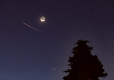 Konstellation Mondsichel, Venus, Jupiter mit “Flugzeugspur”
