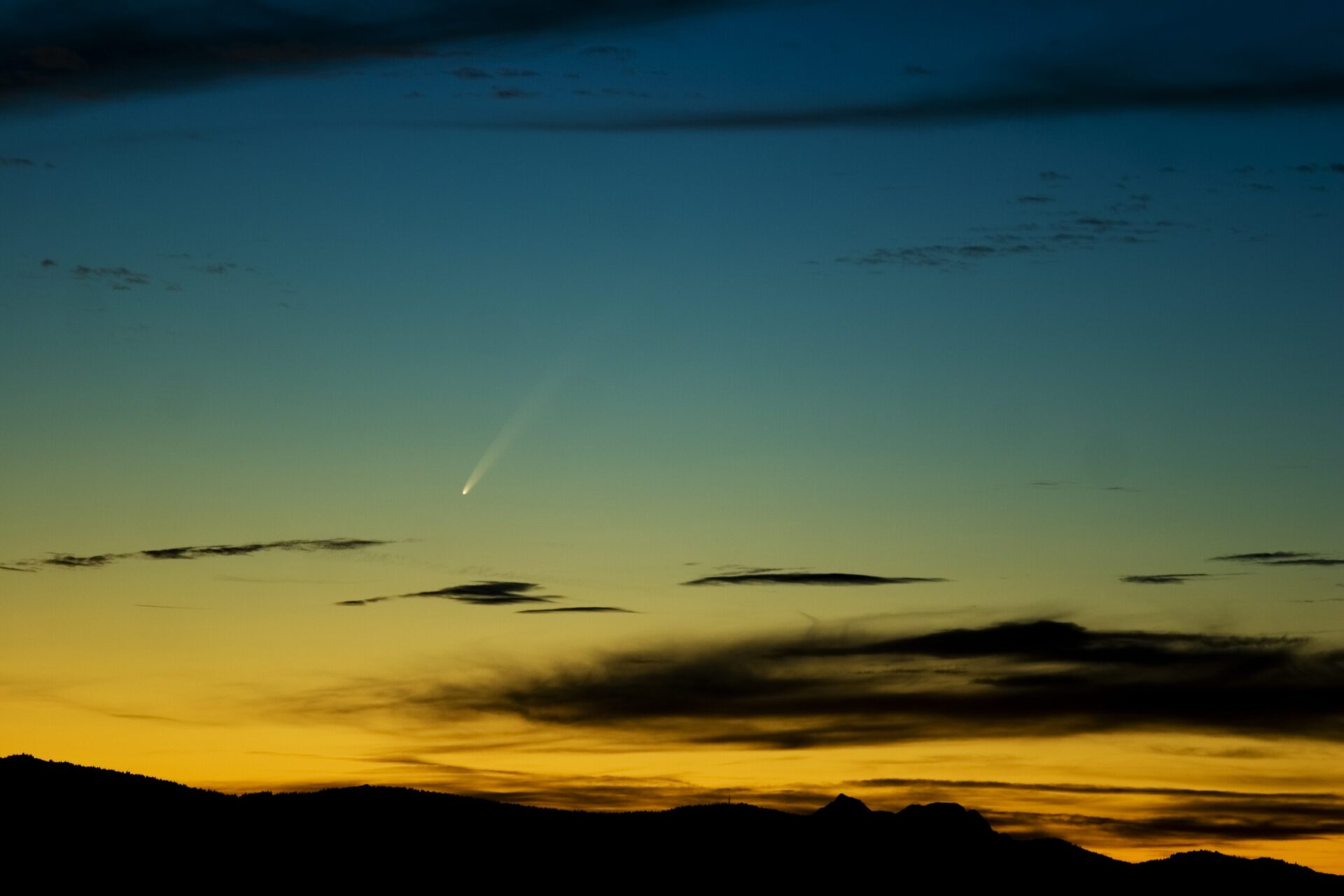 Ein Beispiel eines Kometen in der Abenddämmerung kurz nach Sonnenuntergang.