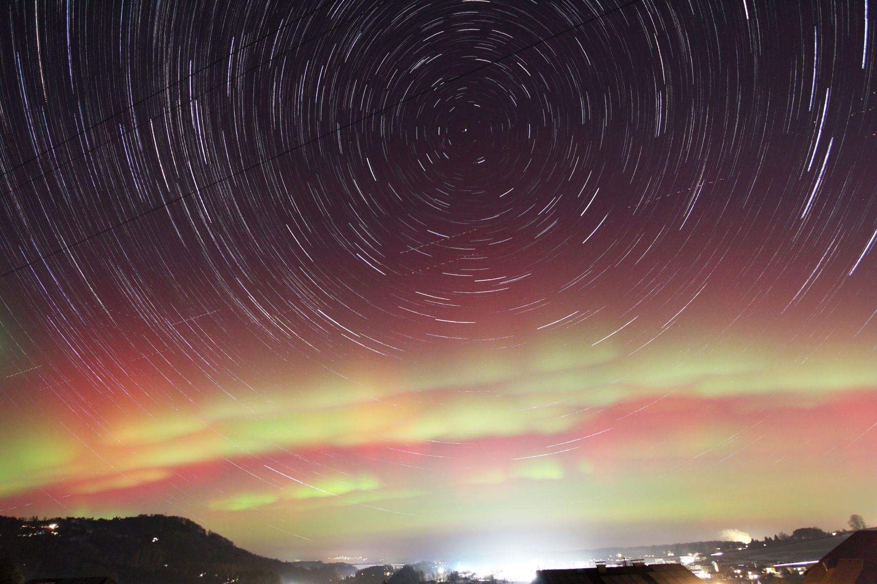 Gegen 21:30 Uhr gab es das erste rote Polarlicht im Norden, noch relativ horizontnah und relativ strukturlos. Das Polarlicht wurde nun laufend heller und zeigte rote Streifenstrukturen. Es wurde breiter und reichte von Nordwesten bis Nordosten. Von etwa 22 Uhr an war auch ein strukturloses grünes Polarlicht horizontnahe erkennbar, das sich laufend verstärkte. Gegen 22.15 Uhr war das Polarlicht bis in etwa in die Höhe des Polarsternes zu sehen. Ab 22:13 Uhr gab es auffällige horizontale helle grün-gelbe Polarlichtbänder im Grenzbereich des roten und grünem Polarlicht. Diese grünen Polarlichtbänder wurden immer heller und größer und wanderten auch immer höher in den Bereich der roten Polarlichterstreifen. Gegen 23 Uhr wurden aus den Bändern grüne Flecken teilweise mit streifiger Struktur. Kurz nach 23 Uhr waren die grünen Flecken verschwunden. Die roten Polarlichtstreifen wurden heller, bis etwa 23.20 Uhr, dann begannen die roten Streifen zu verblassen. Es gab nun nur mehr einen roten Himmel ohne besondere Strukturen, der langsam an Intensität verlor, aber auf den fotografischen Aufnahmen noch sichtbar war. Visuell wurde es nun schwierig das Polarlicht zu erkennen. Von etwa 1:45 bis 2:00 Uhr gab es noch einmal ein kurzes Aufflackern des roten Polarlichtes, danach war auch fotografisch fast nichts mehr zu sehen.